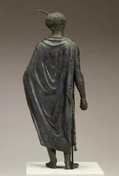 Keywords: Roman - Mercury - Walters 54605 - Back.jpg The wings one missing on the head of this figure identify it as representing Mercury the messenger of the gods It is exquisitely detailed and larger than most statuettes made for household worship suggesting that it was prominently displayed within the villa of a wealthy Roman family The hairstyle dates the piece to the mid 1st century when artists were still very much influenced by the Classical style of Greek art His left hand would have held the caduceus or herald's staff that is his attribute familiar today as a medical symbol AD 40-80 Julio-Claudian ; Flavian cast bronze with silver coat and inlay cm 29 2 11 8 5 6 accession number 54 605 25406 Henry Walters Baltimore date and mode of acquisition unknown Walters Art Museum Henry Walters Acquired by Henry Walters The Gods Delight The Human Figure in Classical Bronze The Cleveland Museum of Art Cleveland 1988-1989 place of origin Roman Empire Walters Art Museum license Ancient Roman sculptures in the Walters Art Museum Ancient Roman bronze statuettes of Mercurius Media contributed by the Walters Art Museum needs category review |