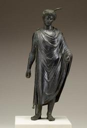 Keywords: Roman - Mercury - Walters 54605.jpg The wings one missing on the head of this figure identify it as representing Mercury the messenger of the gods It is exquisitely detailed and larger than most statuettes made for household worship suggesting that it was prominently displayed within the villa of a wealthy Roman family The hairstyle dates the piece to the mid 1st century when artists were still very much influenced by the Classical style of Greek art His left hand would have held the caduceus or herald's staff that is his attribute familiar today as a medical symbol AD 40-80 Julio-Claudian ; Flavian cast bronze with silver coat and inlay cm 29 2 11 8 5 6 accession number 54 605 25406 Henry Walters Baltimore date and mode of acquisition unknown Walters Art Museum Henry Walters Acquired by Henry Walters The Gods Delight The Human Figure in Classical Bronze The Cleveland Museum of Art Cleveland 1988-1989 place of origin Roman Empire Walters Art Museum license Ancient Roman sculptures in the Walters Art Museum Ancient Roman bronze statuettes of Mercurius Media contributed by the Walters Art Museum needs category review |