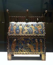 | Keywords: Romanesque Treasure of MNAC- Arqueta resurrecci贸 (modificat).jpg El recorregut de la secci贸 de rom脿nic culmina amb els objectes d 檕rfebreria que constitu茂en els tresors de les esgl茅sies medievals Aquests objectes tenien una funci贸 lit煤rgica per貌 a la vegada formaven el patrimoni material dels temples el seu sistema d 檃cumulaci贸 de riquesa Les vitrines mostren una selecci贸 de peces d 櫭╬oques diverses del fons d 檕rfebreria rom脿nica del Museu Dues es dediquen a l 檃nomenada obra de Llemotges la c猫lebre producci贸 d 檕bjectes de coure esmaltats amb centre en aquesta ciutat del nord d 橭ccit脿nia The Romanesque tour in MNAC culminates with objects of gold which are the treasures of medieval churches These objects have a liturgical function but once formed the material heritage of temples their system accumulation of wealth Showcases a selection of pieces from different periods of the fund of silver Roman Museum Two are dedicated to the work of so-called Limoges famous for producing objects with enameled copper center This northern city of Aquitaine Institution Museu Nacional d'Art de Catalunya 2012-10-25 11 43 14 own PD-Art Romanesque Treasure in the MNAC |