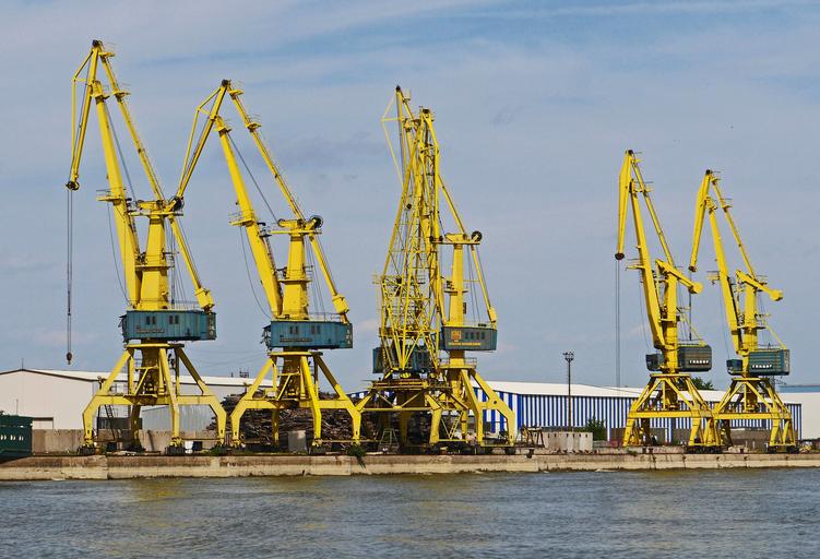 Keywords: romania bank of the danube cranes from eberswalde port harbour cranes inland waterway transport warehouses kai mole investors river current yellow-turquoise water industry envelope port handling galati Romania-cranes-1611969.jpg Hafenkräne an der Donau in Rumänien https //pixabay com/en/romania-bank-of-the-danube-1611969/ 2016-11-20 Kopiersperre <span class signature-talk ></span> Pixabay 1611969 confirmed INeverCry 2016-12-11 Pixabay files for migration/Migrated Port cranes in Romania Level-luffing cranes November 2016 in Romania