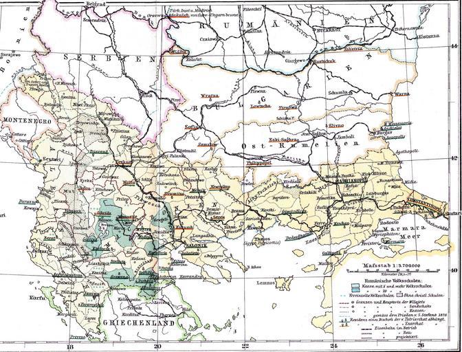 | Keywords: Romanian Schools for Aromanians and Meglenoromanians.JPG Румънски училища в акедония п ез 1899 година Rumänische Schulen für Aromunen und Meglenorumänen im Osmanischen Reich 1886 Rumänische Schulen für Aromunen und Meglenorumänen im Osmanischen Reich 1886 als Beispiel für die Durchdringung Makedoniens durch Schulen der Nachbarländer Map showing areas with Romanian schools for Aromanians and Megleno-Romanians in the European side of the Ottoman Empire 1886 Rumanaj lernejoj por arumano-anoj kaj meglenorumano-anoj en la Otomana Imperio 1886 Carte de 1886 montrant les zones où fonctionnaient des écoles roumaines pour les aroumaines dans l'Empire ottoman Şcoli româneşti în Imperiul Otoman 1886 Школы для а умын и меглено умын в Османской импе ии 1886 Osmanlı İmparatorluğundaki Aroman ve Megleno-romanlar 1886 Petermanns Mitteilungen 1899 own scan PD-old Aromanians Megleno-Romanians Maps of the history of modern Romania 1886 1899 Old maps of the Balkans Old maps of the Ottoman Empire Old maps of Turkey Old maps of Greece Old maps of Bulgaria Old maps of Macedonia Old maps of Albania Old maps of Kosovo Old maps of Romania Old maps of Serbia Old maps of Montenegro Maps of the Vlachs Historical maps of ethnic groups in the Balkans Historical maps of ethnic groups in Greece Historical maps of ethnic groups in Albania Historical maps of ethnic groups in the Republic of Macedonia Maps in German |