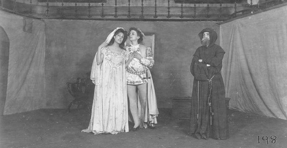 Keywords: Romeo, Juliet, the friar.png Pleasaunce Baker Juliet Mary Nearing Romeo Shirley Putnam Friar Lawrence in Shakespeare's Romeo and Juliet; Bryn Mawr College 1908 H Parker Rolfe Philadelphia 1908 in theatre 1908 in Pennsylvania Bryn Mawr College Romeo and Juliet PD-old |