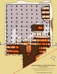 Keywords: Römischer Ziegelbrennofen I, Dömos, Nordungarn.svg de Römischer militärisch genutzter Ziegelbrennofen I mit rechteckiger Lochtenne; 1987 bis 1988 im Ortskern von Dömös nahe dem nordungarischen Donauknie ergraben Der von der Legio I Adiutrix betriebene Brennofen I wurde in eine nach Norden zur Donau hin abfallende lehmige Uferwand gesetzt Der Brennraum beträgt 620x544 cm seine 30 cm breiten Seitenwände wurden aus in Lehm gesetzten Ziegeln errichtet Quelle ARCHAEOLOGIAI ÉRTESÍTŐ Band 121/122 1994 1995 S 97 bis 114 Die S/W-Zeichnung auf S 98 wurde von mir anhand der Grabungsfotos in der Aufsichtsperspektive räumlich gestaltet Die von mir eingesetzten Farben dienen nur der Höhenabgrenzung und waren so nicht am Befund zu finden Archaeologiai Értesítő Band 121/122 1994 1995 S 98 ; Die räumliche Interpretation der rein S/W gelieferten eindimensionalen Tuschzeichung wurde anhand von Grabungsphotos von Mediatus vorgenommen Um Fehlinterpretationen zu vermeiden wurde die räumliche Darstellung teils reduziert widergegeben Mediatus 2016-10-30 other fields + Signs User Mediatus/no-new-version Cc-zero Limes Pannonicus Legio I Adiutrix |