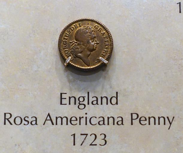 Keywords: Rosa Americana penny, England, 1723 - National Museum of American History - DSC00180.jpg en Exhibit in the National Museum of American History Washington DC USA Photography was permitted in the museum without restriction 2015-03-27 11 27 11 own Daderot other versions cc-zero Coins in the National Museum of American History Rosa Americana coins |