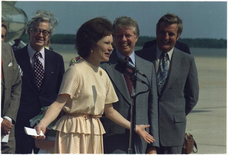 | Keywords: Rosalynn Carter, Jimmy Carter and Vice President Walter Mondale at a ceremony welcoming Mrs. Carter back from her... - NARA - 175133.tif Scope and content General notes 175133 Local identifier President 1977-1981 Carter White House Staff Photographers 01/20/1977 - 01/20/1981 Jimmy Carter Library NLJC 441 Freedom Parkway Atlanta GA 30307-1498 1977-06-12 Record group Collection JC-WHSP Carter White House Photographs Collection 01/20/1977 - 01/22/1981 Record group ARC 1120 Carter White House Photographs Presidential compiled 01/20/1977 - 01/22/1981 Series ARC 173341 File unit Mrs Carter returns from South America 06/12/1977 - 06/12/1977 File unit ARC 175131 Variant control numbers NAIL Control Number NLC-WHSP-C-01713-28A yes Other versions NARA-cooperation PD-USGov Rosalynn and Jimmy Carter Walter Mondale |