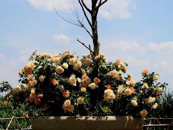 Keywords: rose bush flowers small pink pearly pot large dry tree sky