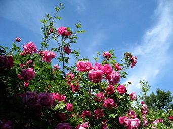 Keywords: roses pink sky blue blue shrubs summer sunshine