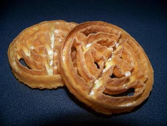 Keywords: Rosette(cookie).JPG en Picture of two Rosette cookies made November 2008 using traditional Scandinavian recipe and iron Alex Harness Digital Camera Picture of Rosettes he produced Nov 2008 Alex Harness 2008-12-01 This is my own work All rights are released Cookies Scandinavian cuisine Rosette-shaped pastries Two of food |
