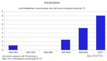 Keywords: Roskosmosfail.png ru Роскосмос Доля ава ийных неуспешных или частично успешных запусков 2013-07-02 18 53 31 own Ewigekrieg aka alex1977b Я аз ешаю использовать это изоб ажение в любых целях без моего согласия и каких-либо д угих условий Данные годы успешный ава ийный  неуспешный частично_успешный 1960-1969 95 1 0 0 1970-1979 174 0 0 0 1980-1989 114 0 0 0 1990-1999 82 0 2 0 2000-2009 167 5 0 4 2010---- 80 1 6 0 Источник данных http //www federalspace ru/main php id 10 официальный сайт оскосмсоса cc-zero Uploaded with UploadWizard Space launch vehicles of Russia