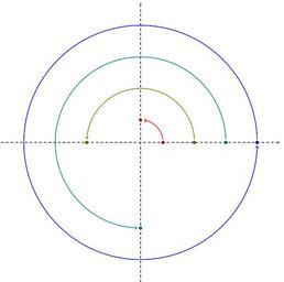 Keywords: Rotations on the complex plane.svg Four numbers on the real line are multiplied by integer powers of the imaginary unit which corresponds to rotations by multiples of the right angle Self-made Written in TeX with TikZ compiled using <code>latex rot tex dvisvgm -n -c1 75 rot dvi</code> Ke r TeX source <source lang latex > \documentclass article \usepackage amsmath \usepackage amsfonts \usepackage tikz \usepackage scalefnt \begin document \pagestyle empty \def\rotarc 1 2 3 4 5 \draw 2 fill 2 1 0 circle 0 03 ; \draw 2 fill 2 1 cos 3 1 sin 3 circle 0 03 ; \drawthick -> 2 1 0 075 arc asin 0 075/ 1 3/2 1 node anchor 5 4 arc 3/2 3-asin 0 075/ 1 1 ; \begin tikzpicture scale 2 \drawdashed -> -3 1 0 -- 3 1 0 node anchor north Re ; \drawdashed -> 0 -3 1 -- 0 3 1 node anchor west Im ; \rotarc 0 5 red 90 i 1 i south west \rotarc 1 2 olive 180 i 2 -1 south west \rotarc 1 9 teal 270 i 3 -i south east \rotarc 2 6 blue 360 i 4 1 south east \end tikzpicture \end document </source> Mathematical diagrams Complex plane Rotation Euclidean plane Cc-zero |