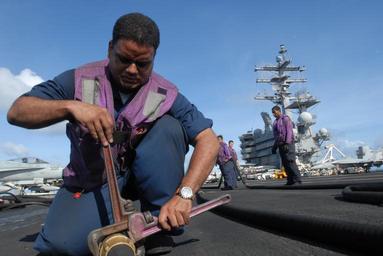 | Keywords: Routine maintenance aboard USS Ronald Reagan DVIDS127139.jpg en Aviation boatswain's mate fuels Petty Officer 1st Class Antonio Osorio tightens a hydrostatic test cap onto the end of a flight deck of the Nimitz-class aircraft carrier USS Ronald Reagan Since such a high water pressure is used to test hoses the caps must be precisely aligned and tightly seated The Ronald Reagan Carrier Strike Group is on a routine deployment in the 7th Fleet area of responsibility Operating in the Western Pacific and Indian oceans the U S 7th Fleet is the largest of the forward-deployed U S fleets covering 52 million square miles with approximately 50 ships 120 aircraft and 20 000 Sailors and Marines assigned at any given time 2008-11-07 Petty Officer 2nd Class Gary Prill https //www dvidshub net/image/127139 081107-N-+++++-021 2008-11-09 06 53 USPACOM AT SEA PD-USGov-Military-Navy Flight deck maintenance aboard USS Ronald Reagan CVN-76 Images from DoD uploaded by Fæ |