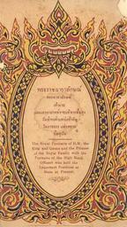 Keywords: Royal portraits - 000.jpg en <br> Cover of the Book The Royal Portraits of HM the King and Queen and the Princes of the Royal Family with the Portraits of the High Rank Officers who hold the Important Positions of State at Present พระบรมฉายาลักษณ์ พระฉายาลักษณ์ จ้านาย แล สวกามาตย์ราชบริพารชั้นสูง อันดำรงตำแหน่งสำคัญในราชการแห่งสยามปัจจุบัน literally The Portraits of Their Majesties Members of the Royal Household and High-Ranking Public Officers of the present Siam <br> The image is derived from the http //www homebankstore com/dl/ebookthbl/118 pdf book provided in pdf form by the Wang Tha Phra Library of Silpakorn University 2011-11-25 own Aristitleism PD-Thailand PD-TH-exempt Uploaded with UploadWizard The Royal Portraits of HM the King and Queen and the Princes of the Royal Family |