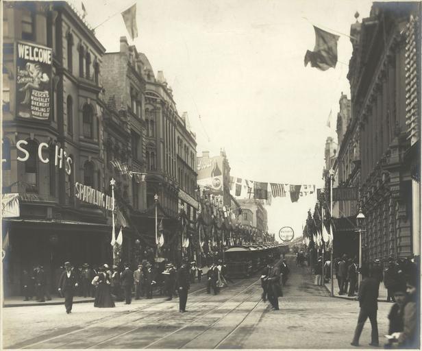 | Keywords: archives state records nsw staterecordsnsw newsouthwales blackandwhite sydney king street kingstreet pitt street pittstreet people women federation decorations flags tram road outdoor black and white King Street, Sydney, from Pitt Street intersection decorated for visit of Duke and Duchess of Cornwall and York, includes tribute to the late Queen Victoria. Dated: May 1901 Digital ID: 4481_a026_000277 Rights: www.records.nsw.gov.au/about-us/rights-and-permissions We'd love to hear from you if you use our photos/documents. Many other photos in our collection are available to view and browse on our website using Photo Investigator. King Street, Sydney, from Pitt Street intersection decorated for visit of Duke and Duchess of Cornwall and York, includes tribute to the late Queen Victoria. Dated: May 1901 Digital ID: 4481_a026_000277 Rights: www.records.nsw.gov.au/about-us/rights-and-permissions We'd love to hear from you if you use our photos/documents. Many other photos in our collection are available to view and browse on our website using Photo Investigator. |