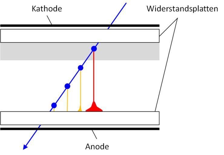 Keywords: RPC.png en RPC detectors consist of two gas enclosing layers of high-ohmic material resistive plates which are coated with copper cathode and anode on the outside A voltage difference accelerates electrons created via primary ionization blue dots of the gas by a charged particle blue arrow traversing the chamber to the anode where a signal is induced Only electrons that are created near the cathode grey area reach sufficient energy to induce a detectable signal indicated in red Thus primary ionization for detectable signals exclusively occurs within a small area near the cathode grey area de Schematischer Aufbau eines RPC-Detektors Zwei Widerstandsplatten resistive plates umschließen ein Gasvolumen An den Außenseiten befinden sich Elektroden zwischen denen eine hohe Spannungsdifferenz anliegt Tritt ein geladenes Teilchen blauer Pfeil in die Kammer ein werden Gasmoleküle ionisiert Primärionisation blaue Punkte Die langsamen Ionen driften zur Kathode die schnellen Elektronen zur Anode Lediglich diejenigen Elektronen die nahe der Kathode erzeugt wurden erhalten während der Drift ausreichend Energie um ein detektierbares Signal zu erzeugen in rot dargestellt Daher findet die Primärionisation für auslesbare Signale ausschließlich in einem kleinen Bereich nahe der Kathode statt grauer Bereich own Witten 2012-05-03 Particle detectors Cc-zero |