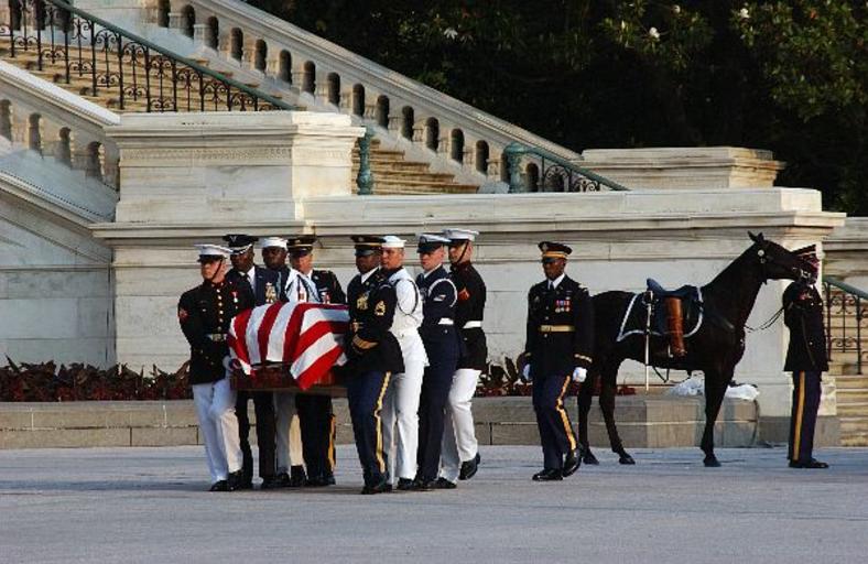 Keywords: RRFUNERAL-casket removed from caisson.jpg http //www navy mil/view_image asp id 15058 source Ceremonial Honor Guard carry the flag-draped casket of former President Ronald Reagan up the steps of the U S Capitol PD-USGov-Military-Navy Flag-draped casket of Ronald Reagan at his state funeral Riderless horses funeral tradition |