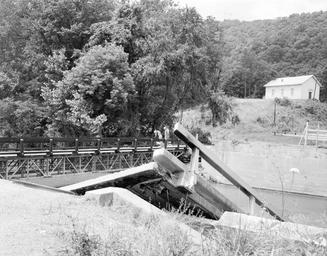 Keywords: richmond va usa hurricane agnes hurricaneagnes virginia flood flooding natural disaster richmond va usa naturaldisasterrichmondvausa blackandwhite monochrome outdoor black and white The collapsed bridge on Rt. 639, near its intersection with Rt. 637, was replaced with a temporary H-10 type bridge. Located in Montgomery County, approximately 3 1/2 miles south of Shawsville. No. 72-1395, Virginia Governor's Negative Collection, Library of Virginia. The collapsed bridge on Rt. 639, near its intersection with Rt. 637, was replaced with a temporary H-10 type bridge. Located in Montgomery County, approximately 3 1/2 miles south of Shawsville. No. 72-1395, Virginia Governor's Negative Collection, Library of Virginia. |
