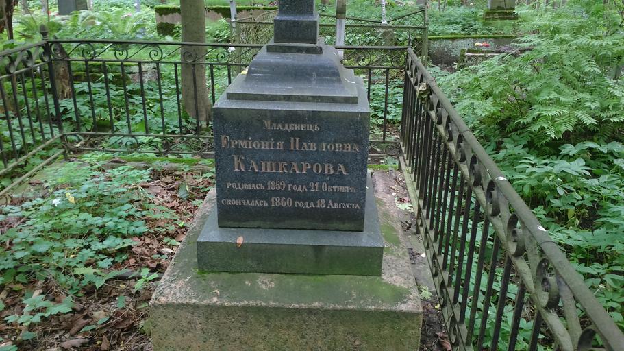 | Keywords: Ru-Kashkar-EP.jpg Art Photo en Kashkarova E P burial at the Smolensk Orthodox cemetery ru Захо онение Кашка овой Е П доче и Кашка овой Е С у Да гомыжская на Смоленском п авославном кладбище 1860 stone Russia Saint-Petersburg Smolensk Orthodox Cemetery object history exhibition history credit line accession number artwork license PD-Russia photo date 2016-06-29 Dj-2 own photo license cc-by-sa-4 0 Smolensk Orthodox cemetery | ||||