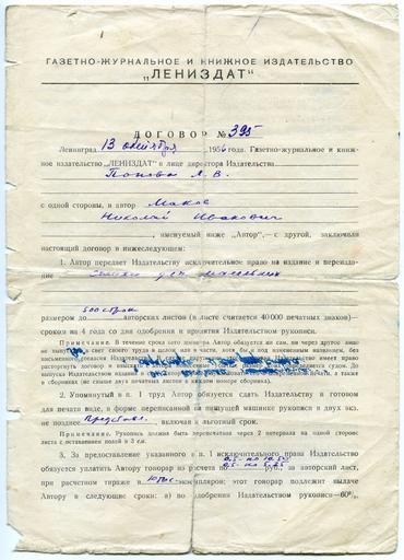 | Keywords: Ru-Lenizdat-dog-first-page.jpg ru Пе вая ст аница догово а 395 от 13 10 1956 года издательства Лениздат заключённого с авто ом ленинг адским поэтом иколаем Ивановичем аковым на издание стихов для маленьких книга Забавные исто ии 1956-10-13 Own archive Not applicable PD-RU-exempt Uploaded with UploadWizard Nikolai Ivanovich Makov |