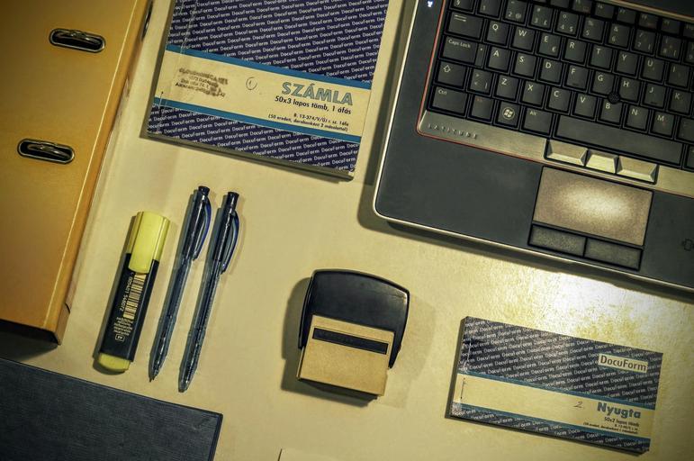 Keywords: rubber stamp laptop keyboard invoice folder pen invoice form receipt book invoice book accountant desk dell latitude business office