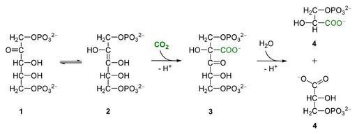MAKE A MEME View Large Image RuBisCO reaction.svg en reactions catalyzed by RubisCO carboxylation of ribulose-1 5-bisphosphate 1 to 3-Phosphoglycerate 4 de die durch RubisCO katalysierte Carboxylierung von Ribulose-1 5-bisphosphat 1 ; Endiol 2 ; 2-Carboxy-3-keto-arabin...