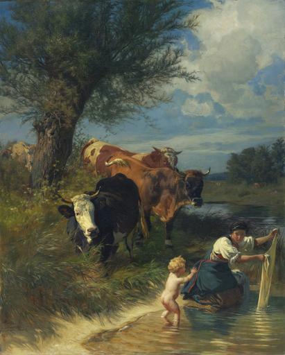 | Keywords: Rudolf Koller - Kühe und Wäscherin am Bach.jpg Artwork Creator Rudolf Koller Kühe und Wäscherin am Bach oil canvas cm 142 114 object history Dr Paul Merian Basel<br/>Als Depositum im Kunstmuseum St Gallen credit line Unten links signiert datiert und bezeichnet Zürich accession number http //www sothebys com/de/auctions/ecatalogue/2012/schweizer-kunst-swiss-art-zh1203/lot 3 html Sotheby's Zürich 04 Juni 2012 lot 3 PD-old-100 Rudolf Koller Paintings of cattle Streams in art Paintings of women doing laundry outdoors Images from Sotheby's Mother and child in art |
