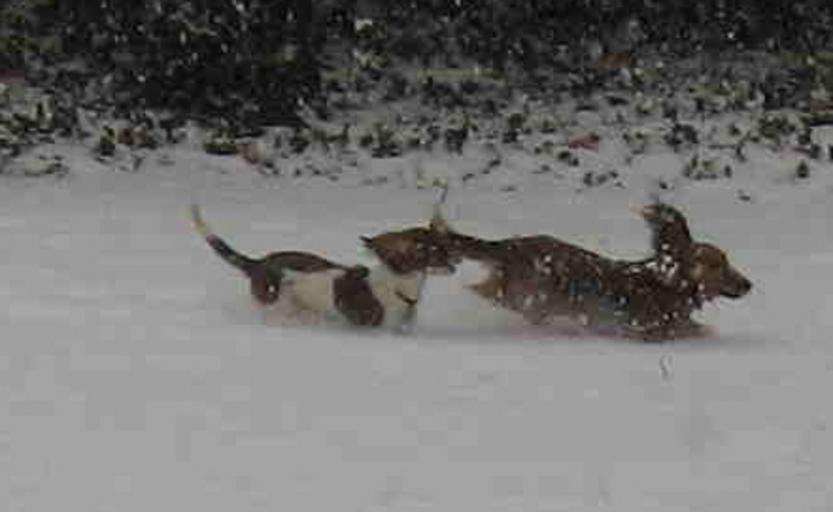 Keywords: Rudyandrogerinsnow.1.jpg en Minature Dachshunds running in the snow longhaired colors red piebald and red own SallyJohnston SallyJohnston 2009-01-14 Dachshund Dogs in snow