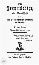 Keywords: Ruef Freymuethige 1.000a.gif Erste Seite des ersten Bandes der Zeitschrift Der Freymuethige http //digilib ub uni-freiburg de/document/256041822/ 1782 Johann Kaspar Ruef Matthias Dannenmayer und Josef Anton Sauter History of Freiburg im Breisgau Location not applicable PD-old-100 |