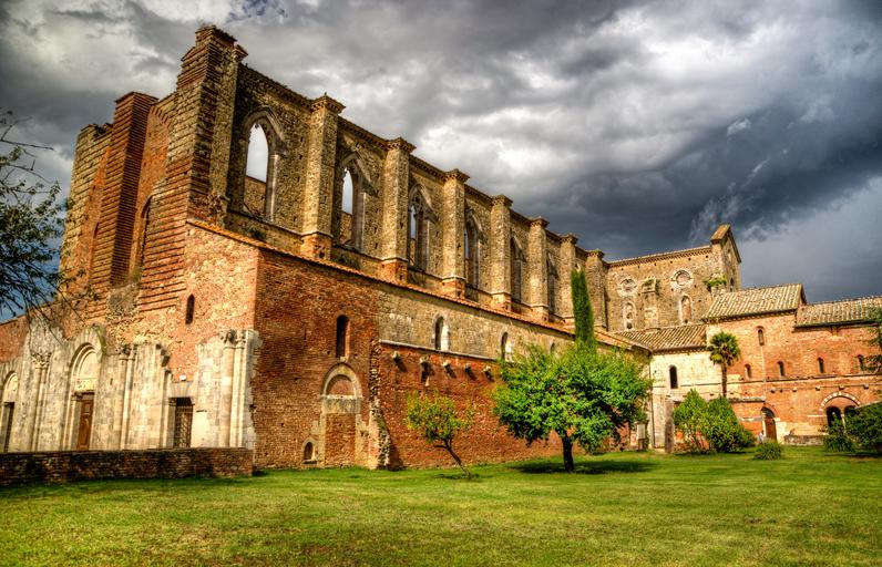 Keywords: ruin abbey hdr sun dark weather thunder storm green italian tuscany tree clouds architecture building ancient old church religion medieval stone landmark gothic monastery historic europe
