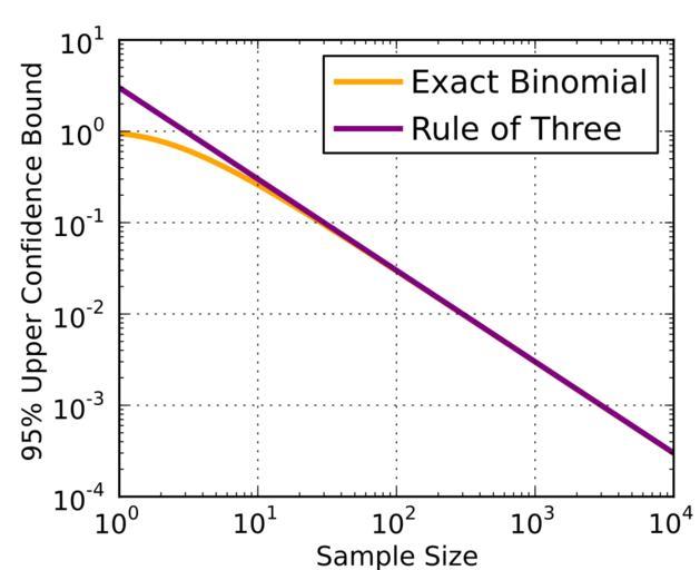 Keywords: Rule of three.svg en Image comparing the rule of three to the exact binomial one-sided confidence interval i e Clopper-Pearson 2014-07-10 09 39 11 own <br /> Created with Matplotlib Bscan <source lang 'python'> Python code shown below This code is issued under the Creative Commons CC0 License from __future__ import division import numpy as np import matplotlib pyplot as plt Set domain of the graph MaxTrials 10000 MinTrials 1 UCB np zeros MaxTrials Get points that are evenly spaced in log-space trials np exp np linspace np log MinTrials np log MaxTrials 100 One-sided exact binomial upper confidence bound equivalent to Clopper-Pearson The choice of confidence interval does matter but this is reasonable and is typically the one from which Rule of 3 is derived See Agresti and Coull 1998 for alternative binomial confidence intervals UCB 1-0 05 1/i for i in trials Rule_of_3 3/i for i in trials plt figure figsize 4 3 2 plt axes 0 17 0 13 0 79 0 8 plt hold True A a plt plot trials UCB '-' color 'orange' lw 2 5 b plt plot trials Rule_of_3 '-' color 'purple' lw 2 5 Formatting A append a A append b ax plt gca ax set_yscale 'log' ax set_xscale 'log' ax grid plt xlabel Sample Size plt ylabel r 95 Upper Confidence Bound leg_str leg_str append Exact Binomial leg_str append Rule of Three bx plt legend A leg_str numpoints 1 handletextpad 0 loc upper right plt savefig rule_of_three svg </source> cc-zero Uploaded with UploadWizard Statistics Probability |