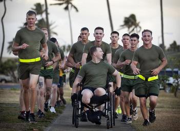 Keywords: Run For a Brother (7314027892).jpg You voted and the Corps Top Shot for June comes from Cpl Reece Lodder Only a few days after returning from a deployment to Afghanistan Lodder joined fellow Marines and sailors from India Company 3rd Battalion 3rd Marines for a motivational run honoring the life and sacrifice of Cpl Garrett Carnes The infantry squad leader lost both of his legs in an improvised explosive device attack in Helmand province in February When his brothers returned from their deployment he greeted them by walking out onto the flightline using prosthetics While running alongside their formation Lodder witnessed a deep camaraderie between the men one forged through challenge and triumph Cpl Carnes' way of life changed when he lost his legs but the radical physical change hasn't dampened his warrior spirit Lodder said The enemy tried to break his body but they couldn't touch his courage and resolve With the support of his wife and family his country and his brothers-in-arms Cpl Garrett Carnes is triumphant Cpl Garrett Carnes in wheelchair a squad leader with 3rd Platoon India Company 3rd Battalion 3rd Marine Regiment and 22-year-old native of Mooresville N C jokes with Sgt Kenney Clark right a fellow India Co squad leader during a motivational run held here May 29 2012 to honor Carnes' life and sacrifice The infantryman lost his legs in an improvised explosive device attack Feb 19 while supporting combat operations in the Khan Neshin district of Afghanistan's Helmand province Shortly before the attack Carnes had earned a combat meritorious promotion to the rank of corporal Teams of his fellow Marines and sailors ran 46 miles in his honor traveling the same distance between the Afghan village in which he was injured Malakhan and the fighting position from which he operated Observation Post Thomas Hill The men of 'America's Battalion' recently returned from their deployment marking the battalion's sixth combat tour in eight years and its final scheduled one to Afghanistan U S Marine Corps photo by Cpl Reece Lodder https //www flickr com/photos/marine_corps/7314027892/ Run For a Brother 2012-05-29 20 47 https //www flickr com/people/40927340 N03 Marines from Arlington VA United States PD-USGov United States Marine Corps Official Page https //flickr com/photos/40927340 N03/7314027892 2016-09-03 23 34 56 United States Government Work Combat Garmsir District Infantry International Security Assistance Force Marine Corps Base Hawaii Operation Enduring Freedom Sacrifice Amphibious forces North Atlantic Treaty Organization Photographers |