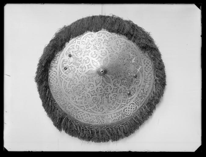Keywords: Rundsköld - Livrustkammaren - 14.tif LSH artwork sv Svagt konisk sköld mjukt övergående i konisk spets med rundad skadad ände med hål för knopp eller dyl Omvikt räfflad kant <br/><br/>Etsad yttäckande ornering i form av ytterst en ring b 70 mm med en löpande bildfris avbruten av sex 8-formiga fält med flätmönster Innanför ringen ett komplicerat flätmönster av 10 mm breda band allt mot prickad bakgrund <br/>Dekor i ringen fält 1 I mitten enhörning vänd v mot sittande kvinna som med h hand håller om mulen och med v hand om manen på enhörningen till v hund Till h om enhörningen två springande hundar och en stående man i lårkort dräkt i h hand hillebard Bakgrund i form av landskap med träd över enhörningen en fågel <br/>Fält 2 Landskap med till v jägare som lägger an bössa med trädstöd mot fågel fyra hundar till h drevkarl med spjut <br/>Fält 3 I mitten hus och därframför en ringlande väg till v man med bardisan två hundar till h stenbock och hund <br/>Fält 4 Landskap med träd i mitten vildsvin till h två hundar till v jägare med vildsvinsspjut och hund <br/>Fält 5 Landskap med träd till h björn vänd åt v över björnen en åt h flygande fågel i mitten två hundar till v stående man med v hand lyft blåser i jakthorn bakom mannen två hundar <br/>Fält 6 I mitten hjort till h man med fällt bardisanliknande spjut hund till v två hundar <br/><br/>Dekor på mittpartiet <br/>I rankverket utsparat sex sköldformiga fält med stående människor <br/>Sköld 1 Kvinna i rustning och långkjol profil v båda händer lyftade och hållande skål flygande band <br/>Sköld 2 Man i antikiserande rustning profil h stödjande sig på bardisan <br/>Sköld 3 Kvinna som i sköld 1 v arm håller palmblad som vilar på axeln h hand en på marken stående sköld <br/>Sköld 4 Man som i sköld 2 stödjer sig på ett yxliknande stångvapen <br/>Sköld 5 Kvinna som i sköld 1 i h hand yxliknande stångvapen <br/>Sköld 6 Man som i sköld 2 v hand stödjer sig på sköld <br/><br/>Bandflätningen löper mellan sköldarna samman i maskaroner banden nertill utgår ur munnen Ovanför maskaronerna fält med fåglar varav 2 ugglor nedanför maskaronerna utefter ytterringen delfiner I övrigt i de utsparade fälten rustningsdelar ibland i form av trofégrupper harar urnor mm <br/><br/>Innanför den räfflade kanten fäst en röd silkesfrans b ca 70 mm och därpå en i nätmönster flätad guldfrans Fransarna fästade med nitar med välvda mässingshuvuden <br/><br/>Två + två nithuvuden för bärremmarna höga svagt koniska huvuden med skruvskåra och filade linjer <br/><br/>Skölden invändigt klädd med rött mycket slitet läder På mitten fäst en rektangulär platta l 375 mm b 85-105 mm Därunder fäst dels handrem i form av rep klätt med läder samt en bred spännrem b ca 80 mm urspr med två spänntampar den yttre saknas En oval sölja av förgyllt stål fäst på läderrem l 75 mm b 30 mm På ena sidans nitar fäst bärrem b 30 mm o l ca 85 mm med likadan sölja som spännremmens söljremmens l 190 mm original caption rundsköld - LRK 9736 Erövringen av Warszawa Karl X Gustavs död och begravning ca other date - 1550 1600 steel - silk Färg röd material silke - gold thread - leather g 4050 size mm 585 120 LRK Karl VIII Knutsson Bonde av Sverige kung Wawel 1000-2000 2000 Eagle and Three Crowns 2002 Eagle and Three Crowns 2002 Örnen och de tre kronorna 2003 Krigsbyte 2007-2008 place of origin original filename LN_A00140_000140 45171 inventory number LRK 9736 14 CC0 Rundsköld - Livrustkammaren - 14-negative tif <gallery caption Different images of same object > File Rundsköld Italien 1500-talets andra hälft - Livrustkammaren - 44034 tif File Rundsköld - Livrustkammaren - 59939 tif </gallery> Funeral of Charles X Gustav of Sweden Media contributed by LSH unmatched event Media contributed by LSH unmatched objKeyword Shield images from Livrustkammaren Media contributed by LSH 2014-06 |