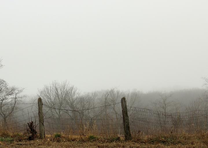 Keywords: rural country fence post wood wire fog mist grey dreary nature field yellow decay borderline
