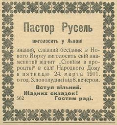 | Keywords: Russell-Dilo-1911-03.jpg uk ви ізка з львівської газети Діло за бе езень 1911 оку в якій гово илось п о пибуття пасто а Рассела до Львова з біблійною п омовою pl Zapowiedź wykładu Charlesa Russella we Lwowie w dniu 24 marca 1911 oryginalnie załadowany na uk wiki - Геннадій Самолюк en Charles Taze Russell in Lwow 1911-24-03 Газета Діло 24 бе езня 1911 оку сто 8 gazeta Діло Lwów 24 marca 1911 No 66 str 8 1911-03 newspaper Dilo PD-Old Charles Taze Russell | ||||