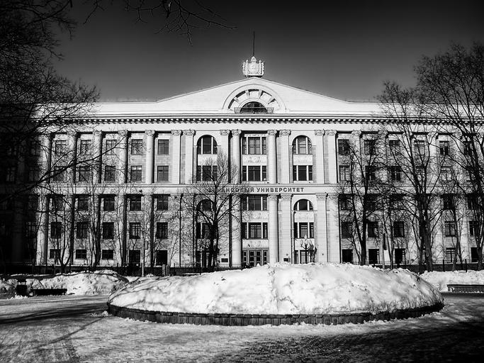 Keywords: russia finance university school building architecture sky clouds winter snow black and white