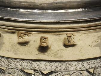 Keywords: Russian - Covered Cup with Large Foot - Walters 57807 - Mark A.jpg Around the body of the cup is a silver envelope with pierced designs and three portrait medallions in repoussé The finial of the cover is designed as a double-headed eagle 1745 Early Modern silver parcel gilt cm 14 7 accession number 57 807 24053 Alexandre Polovtsoff Aleksandr Aleksandrovich Polovtsov St Petersburg and Paris by purchase Henry Walters city Baltimore Walters Art Museum Henry Walters Acquired by Henry Walters 1930 Bears the marks of an unknown maker 'VD' who was active 1741-1753 It also bears the assayer's mark of Andrei Zaitsev who was active from 1735-1749 Several marks on rim Moscow 1745 Russian Art Icons and Decorative Arts from the Origin to the Twentieth Century The Walters Art Gallery Baltimore 1959-1960 place of origin Moscow Russia Walters Art Museum license Decorative and applied arts of Russia Media contributed by the Walters Art Museum needs category review Collections of the Walters Art Museum Hallmarks from Russia |
