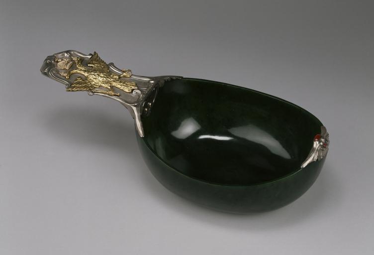 | Keywords: Russian - "Kovsh" with Imperial Eagle - Walters 571076 - View A.jpg The kovsh is a drinking vessel that traces its origins to a medieval wooden boat-shaped ladle This example is made with Siberian jade or nephrite It was intended to be an imperial piece but was never delivered The kovsh was sent by Pottier to Henry Walters in 1930 1911 nephrite silver gold diamonds rubies cm 10 5 32 1 accession number 57 1076 14699 Henry Walters Baltimore date and mode of acquisition unknown Walters Art Museum Henry Walters Acquired by Henry Walters May 6 1911 Russian Art Icons and Decorative Arts from the Origin to the Twentieth Century The Walters Art Gallery Baltimore 1959-1960 A Millennium of Christianity Russian Art from The Walters Art Gallery The Walters Art Gallery Baltimore 1988-1989 The Fabergé Menagerie The Walters Art Museum Baltimore; Columbus Museum of Art Columbus; Portland Art Museum Portland 2003-2004 place of origin St Petersburg Russia Walters Art Museum license Decorative and applied arts of Russia Collections of the Walters Art Museum Cups 1911 in art Nephrite objects Silver objects from Russia Gold objects Ruby jewellery Diamonds Ladles Kovshs Crowned double-headed eagles Coats of arms of the Russian empire Double-headed eagle of Russia |