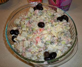 Keywords: Russian salad.jpg Russian Salad true to modern post-Soviet convention in typical appearance and ingredients excepting the olives which are not standard A homemade variant containing potatoes peas cabbage sweet gherkins capers ham carrots olive oil wine vinegar dijon mustard and sour cream garnished with black olives own Cmkeating2 talk created this work entirely by myself 1 17 41 1 January 2010 UTC Cmkeating2 talk Cmkeating2 Original upload log en wikipedia Kelly CommonsHelper en wikipedia Russian+salad jpg 2010-01-01 17 41 Cmkeating2 3648×2736× 1715242 bytes <nowiki> I ~~~ created this work entirely by myself ~~~~~ ~~~ </nowiki> Olivier salad |