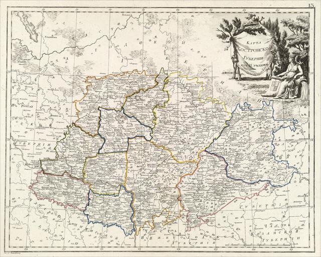 | Keywords: RussianEmpireMap1800-13-KostromskayaProvince.jpg Атлас Российской импе ии 1800 год Лист 13 Кост омская губе ния из 11 уездов en Atlas of Russian Empire 1800 year List 13 Kostromskaya Province from 11 uyezds ста ая ка та en old map 1800 Александ ихайлович Вильб ехт en Aleksandr Mikhaylovich Vilbrekht Author died more than 70 years ago - public domain PD-old-100 Atlas of Russian Empire 1800 year Maps of Kostroma Governorate | ||||