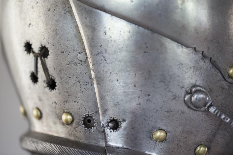 Keywords: Rustning och nitar, 1500-talets slut - Skoklosters slott - 100609.tif LSH artwork sv Helrustning ej komplett Alla delar stämplade med Augustburgs pinjekotet och sax Enligt 1930 års katalogkort även med initialerna C S har ej kunnat upptäckas nu 1500-talets slut <br/>Bestående av 19760819 <br/>Bröstharnesk 14855 1<br/>Ryggharnesk 14855 2<br/>Ringkrage 14855 3<br/>ländskört 14855 4<br/>h axelstycke med armskydd 14855 5<br/>h handske 14855 6<br/>v axelstycke med armskydd 14855 7<br/>h lårskena med knäbuckla 14855 8<br/>v lårskena med knäbuckla 14855 9<br/>hjälm 14855 10<br/>v handske 14855 11<br/>14855 1 Bröstharnesk Låg rundad snedräfflad halshanr Dubbla graverade linjer kring hals armar och nedre kant Svagt markerad mittås Två mässingsnitar i nederkanten - för att fösta tassetterna vilka nu saknas Har troligen haft dekor av mässingsnitar utmed nederkanten Spår finnes Fastnitade läderremmar vid axlarna - att spännas vid ryggstycket <br/>H 380 mm bröstvidd 500 mm <br/>14855 2 Ryggharnesk Låg rundad snedräfflad halskant Graverade linjer på motsvarande sätt som bröstharneskets axelstycken I midjans högra sida fastnitad vit sämskad rem - spår av läderrem i vänster sida finnes <br/>H 365 mm ryggvidd 530 mm <br/>14855 3 Ringkrage med halskrage bestående av tre lameller upptill avslutad med snedräfflad kant Mässingsnitar Fodrad med vitt matlareat tyg kantat med röd sammet <br/>14855 4 Ländskört Bestående av fem lameller med mässingsnitar Påhakat vid ryggharnesket på högra sidan spärrat med hake <br/>H 180 mm b 870 mm <br/>Tillbehör Stativ nr 14866<br/>14855 5-7 11 Axelstycken med armskydd och till hörande handskar Axelstycket består av fem lameller - ryggbladen stora De sidor som går in över överarmsskyddet har tandad kant Främre nedre lamellen med mässingsros saknas på 14855 7 Axelskydd med mässingsfodrat spänne i vilket rem från ringkragen spännes Armbucklan med snidad lotusblomma Handske nr 14855 6 är komplett med stelt handledsskydd och hand-och fingerskydd T o m främre knogen bestående av lameller 14855 11 saknar de sex främre lamellerna med knogskydd 14855 11 har röd sammetskantad överkant - saknas på 14855 6 <br/>L armskydd 770 mm diam 470 mm l handske 67 mm fel mått diam 97 fel mått mm<br/>14855 8-9 Lårskenor med knäbucklor Lårskenan i två delar Den övre bestående av 4 lameller - den undre av en hel skena med knäbuckla av 8 lameller nr 14855 8 saknar nedersta delen Skarven mellan de båda delarna ornerade med räffelgraverad rund kant Dekor av graverade linjer och mässingsnitar <br/>L 520 mm b 360 mm <br/>14855 10 Hjälm visir hjälm låg mjuk rundad kant Utan hjälmkrage nertill avslutad med liten kant räffelgraverad Högra sidan med stödstång för visiret Invändigt korsade hjässremmar av sämskat skinn <br/>H 300 mm original caption Rustning och nitar 1500-talets slut <br/> Nyckelord Nitar Stål Rustning Föremålsbild end other date century 16 size mm 1040 SKO C S place of origin original filename sm_dig15703 35687 inventory number SKO 14855 100609 CC-BY-SA Miguel Herranz <gallery caption Different images of same object > File Rustning 1500-talets slut - Skoklosters slott - 100602 tif File Rustningshandske 1500-talets slut - Skoklosters slott - 100608 tif File Armskydd till rustning 1500-talets slut - Skoklosters slott - 100607 tif File Rustning och nitar 1500-talets slut - Skoklosters slott - 100605 tif File Hjälmvisir 1500-talets slut - Skoklosters slott - 100603 tif File Hjälmvisir 1500-talets slut - Skoklosters slott - 100604 tif File Rustning och nitar 1500-talets slut - Skoklosters slott - 100606 tif </gallery> Steel Armour Rivets Miguel Herranz Media contributed by LSH 2015-11 Arms and armour in the Skokloster Castle |