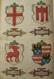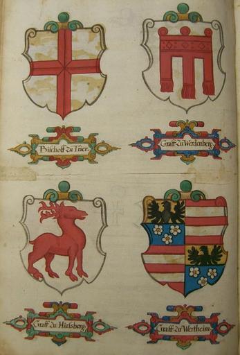 Keywords: Rüxner Turnierbuch Abschrift 17Jh 61.jpg Um Zusätze vermehrte Abschrift von Sigmund Feyerabends Frankfurter Ausgabe 1578/1579 des Turnierbuchs von Georg Rüxner Jörg Rugen Handschrift auf Papier in zwei Bänden 17 Jahrhundert <br /><br />Detail http //www neumann-walter de via ebay de century 17 anonymous PD-Art Rüxners Turnierbuch Abschrift 17 Jh Trier See coat of arms Coats of arms of Werdenberg family Coats of arms of Wertheim family Coats of arms of families of Germany - H Hirschberg |