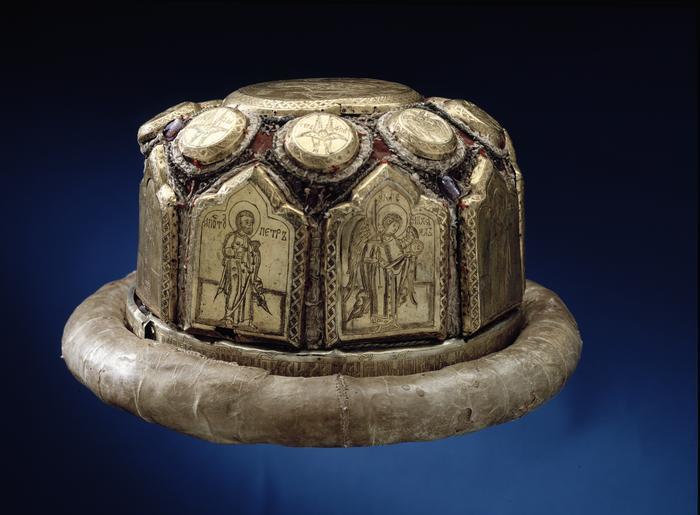 Keywords: Rysk-ortodox mitra från 1650 - Livrustkammaren - 47481.tif LSH artwork sv Krigsbyge från Narva <br/>Mitra av hattformig modell med cylindrisk kulle med svagt rundad kant Vulstformigt brätte b ca 30 mm klätt med pergament ursprungligen med skinn Kullen klädd med delvis mycket slitet karminrött siden nertill vid brättet ring av förgylld silverplåt b 30 mm med graverad gammalslavisk text översättning se Bodin <br/>År 7 159 november 17 dagen gav statssekreteraren Michail Danilovs hustru änkan Uljana dotter till Vasilij denna biskopsmössa till Tjudovklostret till den undergörande Aleksijs hem till minne av sin make Michail Danilovitj eremitmunken Misail och sin dotter Ksenia för sin själ<br/>Därovanför en krans med sex ursprungligen nio helgonbilder graverade på rektangulära plåtar med trepassformig överdel mellersta bågen spetsig h 83 mm b 58 mm gammalslaviska texter <br/>1 - ett manligt helgon med otydlig text pete ; 2 - ärkeängeln Gabriel achange gabri ; 3 - Maria mrthy mätär Theo - Guds moder ; 4 - ärkeängeln Mikael achage michail ; 5 - evengelisten Petrus apoto petr ; 6 - helgon i biskopsdräkt st alekse miro <br/>På kullens översida en krans med nio runda plåtar med serafer och keruber fyra stycken med text serafim fem med cherubi <br/>Mitt på kullen en stor rund plåt d 102 5 mm med Maria och Jesusbarnet text mrthy Guds Moder <br/>Runt plåtarna broderier med silke silvertråd och -paljetter två ovala genomborrade glaspärlor bevarade <br/>Hatten invändigt stoppad och klädd med blekrött siden original caption Rysk-ortodox mitra från 1650 <br/> Nyckelord Liturgi Kristendom Religioner Huvudbonader Slaget vid Narva 1650 silver - silver - silk Färg röd karminröd material siden - parchment size mm 265 bräm g 6145 size mm 150 ca size mm 195 kulle LRK Karl XII av Sverige Mille ans de tradition chret 1988-1989 Kungens lockpipa 1995-1996 Karl XII och Peter den store Peter den store och Karl XII - i krig och fred 1998-1999 Livrustkammaren Krigsbyte 2007-2008 300-årsminnet av slaget vid Poltava / Poltava 300 Years Eremitaget och Kreml-museet 2009-2010 achange gabri Gabriel achage michail Mikael mrthy Mätär Theou - Guds Moder Maria apoto Petr S t Petrus Per st alekse miro S t Alexej Miro achange gabri Gabriel achage michail Mikael mrthy Mätär Theou - Guds Moder Maria apoto Petr S t Petrus Per st alekse miro S t Alexej Miro place of origin original filename lm_t05142 42045 inventory number LRK 5388 47481 CC-BY-SA <gallery caption Different images of same object > File Mitra Tchudov-klostret - Livrustkammaren - 38923 tif </gallery> Liturgy Headgear Religion Christianity Battle of Narva 1700 Media contributed by LSH dim-with multiple size templates Media contributed by LSH 2014-11 |