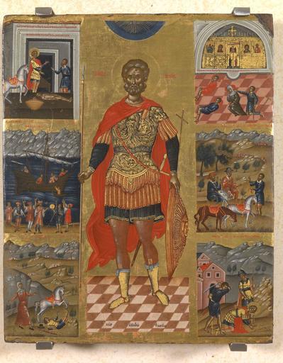 Keywords: S.Menas by E.Lambardos (17th c.).jpg Ο Άγιος ηνάς με σκηνές α ό τον βίο του ρώτες δεκαετίες 17ου αιώνα 32x39εκ Εμμανουήλ Λαμ άρδος ΧΕΙΡ Ε Α ΟΥΗΛ ΤΟΥ ΛΑ ΠΑΡΔΟΥ Στο κέντρο εικονίζεται ο άγιος ηνάς ως αιγύ τιος μεσήλικας στρατηλάτης Φοράει στρατιωτική ενδυμασία με ορφυρό μανδύα κρατεί δόρυ στο δεξί χέρι και με το αριστερό την ασ ίδα του και σταυρό Αριστερά και δεξιά υ άρχουν ανά τρία εικονίδια με τα θαύματα και το μαρτύριο του αγίου σύμφωνα με τη διήγηση του Συναξαριστή http //eib xanthi ilsp gr/gr/icons asp cursort iconTitle selectFieldValue vpage 3 first decades of the 17th century Emmanuel Lambardos Emmanuel Lambardos Files uploaded by Shakko from various sources Saint Menas in icons PD-old |
