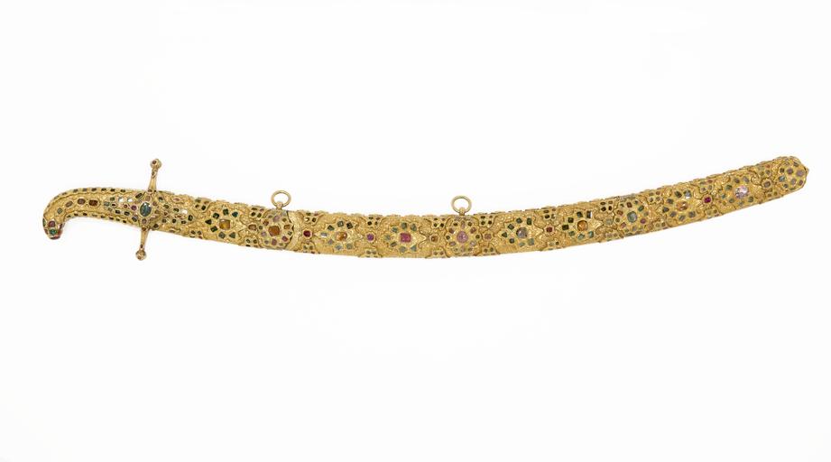 Keywords: Sabel med balja, 1600-tal - Skoklosters slott - 103712.tif LSH artwork sv Balja helt klädd med guldbleck På utsidan ornerad med graverade blommor mot punsad botten och rikt besatt med röda och gröna halvädelstenar och folierade glasbitar Mitt på baljan stora rosettformiga och palmettformiga fattningar med rosa och gröna stenar Längs kanterna mindre fattningar På baksidan bladformiga fattningar På insidan ornament och kantbård med fina niellerade rankor omgivna av graverade blad och blommor mot punsad botten Tre beslag med rosettinfattningar på utsidan ca 50 mm bredaoch niellerade band 21 mm på baksidan Två med hållare med runda koppelringar Urtag för fästets styrskenor kantat av gröna stenar Trekantig genombruten släpsko original caption Sabel med balja 1600-tal <br/> Nyckelord Juveler Sabel Glitter Guld century 17 wood - glass g 1080 size mm 66 880 LRK Karl XI av Sverige Arnusch Wertanson köpman Livrustkammarens basutställning 1978 Islamiskt i de kungliga samlingarna 1984 Kungens lockpipa 1995-1996 place of origin original filename lm_dig17326 43996 inventory number LRK 7718 103712 CC-BY-SA Jenny Bergensten <gallery caption Related objects > File Sabel och balja 1600-tal - Skoklosters slott - 103713 tif LRK 7717 File Sabel kilij Turkiet 1600-talet - Livrustkammaren - 68843 tif LRK 7717 File Sabel och balja 1600-tal - Livrustkammaren - 103711 tif LRK 7717 </gallery> Gold Glitter Sabres of Turkey 17th-century works Sheaths Jenny Bergensten Media contributed by LSH 2015-11 Arms and armour in the Skokloster Castle