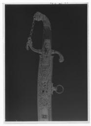 Keywords: Sabel med orientalisk klinga och franskt fäste, samhörande med - Livrustkammaren - 69804-negative.tif Fäste av punsat och ciselerat förgyllt silver kappa med lodrät oval därpå plastisk lejonmask med ring i munnen kappan går ned ett stycke på kaveln på framkant och sidor rankdekor <br/>Kryss styrskenor och parerstänger i ett stycke Rektangulärt kryss och därpå 90 mm höga och 33 mm breda sexkantiga plattor vars nedre del bildar styrskena dekor i form av naken krigare med hjälm och gehäng stav i v hand oval sköld bakom benen S-formigt svängda parerstänger den främre avslutad med bockliknande maskaron den bakre av djur som biter i orm som i sin tur slingrar sig om djurets hals och biter det i nosen Parerstängerna närmast krysset balusterformiga stämplar på inre och yttre parerstången på yttersta ringen samt på kappans oval vildsvinshuvud kontrollstämpel från den 10 maj 1838 Tardy Les Poincons de garantie --- 6 uppl sid 182 Handkedja i form av 18 dubbla ringar samt 2 enkla fästade i ringen i lejonmunnen samt i ormen <br/>Räfflad kavel av pärlemor<br/><br/>Klinga eneggad damaskerad med 235 mm lång jelman mittpå klingan smal hålkäl och däröver två skålningar mot ryggen På starka delen vid ryggen nerslipat en rektangel däri på utsidan inskrift inlagd med guld Innanför styrskenan likaså guldinskrift insidans rektangel tom <br/><br/>Gåva av HM Konung Gustav V genom överintendent Böttiger tidigare i samling Bernard Franck No 36 SH Skall enligt uppgift på pappersetikett på baljan ha tillhört marskalk Bernadotte original caption 1838 steel b2 - blankvapen - klinga material stål - gold b5 - blankvapen - klingdekor material guld - silver b1 - blankvapen - fäste material silver size mm 871 size mm 156 size mm 720 klinga size mm 35 klinga g 1030 LRK Jean Baptiste Bernadotte Karl XIV Johan prins Karl XIV Johan 1764- Pau Frankrike Bernhard-Franck Vapensamlare Karl XIV Johan av Sverige-Norge Vapens utsmyckning föredrag av Magnus Green och Florence Villén 17 feb 2011 för Vapenhistoriska Sällskapet 2011 Övre korridoren place of origin original filename LN_B10308_013188 42332 inventory number LRK 5724 69804 CC0 Sabel med orientalisk klinga och franskt fäste samhörande med - Livrustkammaren - 69804 tif |