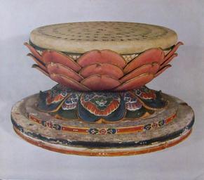 Keywords: Sacred Lotus Pedestal Byodoin.jpg Sacred Lotus Pedestral enclosed in Wood statue of Amidaba in Phoenix Hall in UJI Kyoto Japan Wood Colored diameter 37 6cm height 19 7cm Sanscrit Mantra is written on the upper disk 11th century Heian Period Japan 蓮台 鳳凰堂阿弥 仏胎内封入 径37 6cm 高19 7cm 上 には阿弥 如 の大呪小呪を輪形に梵字で墨書 大和文華 第18号 昭和31年1 1日 YAMATO BUNNKA No 18 1956-01-01 editor YAMATO-BUNKAKAN Osaka Japan 1956-01-01 YAMATO-BUNKAKAN PD-Japan-oldphoto National Treasures of Japan sculptures Byōdō-in Uji Art of the Heian period |
