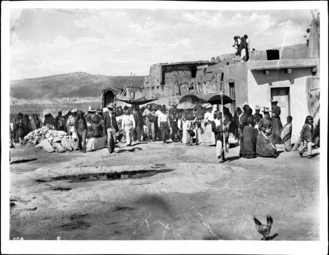 | Keywords: Sacred procession for the Fiesta de San Esteban (Saint Stephen), Acoma Pueblo, ca.1900 (CHS-4518).jpg en <br> Sacred procession for the Fiesta de San Esteban Saint Stephen Acoma Pueblo ca 1900 Photograph of the sacred procession for the Fiesta de San Esteban Saint Stephen Acoma Pueblo ca 1900 The crowd of more than a hundred can be seen at center walking in a procession The women wear long dresses while the men wear long-sleeved shirts and trousers Some of the women carry parasols The dirt road on which they walk has a slight depression filled with water to the left of center A rooster is visible walking across the road in the foreground The adobe buildings of the Pueblo are visible in the background at right A mountain range rises in the distance Call number CHS-4518 Photographer James George Wharton Filename CHS-4518 Coverage date circa 1900 Part of collection California Historical Society Collection 1860-1960 Type images Geographic subject city or populated place Acoma Pueblo Repository name USC Libraries Special Collections Accession number 4518 Microfiche number 1-160-19 Archival file chs_Volume96/CHS-4518 tiff Part of subcollection Title Insurance and Trust and C C Pierce Photography Collection 1860-1960 Repository address Doheny Memorial Library Los Angeles CA 90089-0189 Geographic subject country USA Format aacr2 2 photographs transparency photoprint b w ; 20 x 25 cm 17 x 22 cm Rights Digitally reproduced by the USC Digital Library; From the California Historical Society Collection at the University of Southern California Subject adlf tribal areas Project USC Repository email specol usc edu Identifying number unidentified no James-867 Contributing entity California Historical Society Date created circa 1900 Publisher of the digital version University of Southern California Libraries Format aat transparencies; photographic prints; photographs Geographic subject state New Mexico Legacy record ID chs-m16854; USC-1-1-1-13461 Access conditions Send requests to address or e-mail given Phone 213 821-2366; fax 213 740-2343 Subject file heading Indians -- Acoma Subject lcsh Indians of North America; Acoma Indians Subject Acoma Indians circa 1900 date created George Wharton James 1858 1923 http //digitallibrary usc edu/cdm/ref/collection/p15799coll65/id/16776 PD-old-70-1923 Images from USC Digital Library uploaded by Fæ Photographs by George Wharton James California Historical Society Collection 1860-1960 Acoma Pueblo |