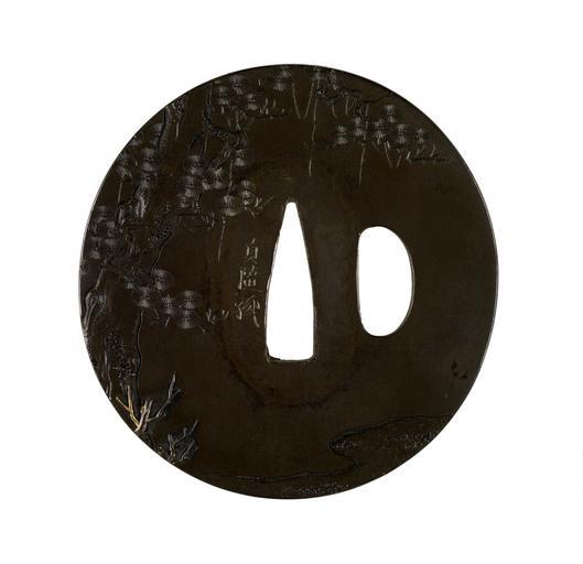 | Keywords: Sadayuki - Tsuba with Chinese Generals Kanyu, Gentoku and Chohi - Walters 51340 - Back.jpg Under a pine tree at the right of this tsuba are three Chinese generals Kanyu Ch Guan Yu Kuan Yu Gentoku Ch Liu Bei Liu Pei and Chohi Ch Zhang Fei Chang Fei They fought together in the 2nd century at the beginning of the Three Kingdoms period Gentoku eventually became emperor of Shu Shu On the reverse of the tsuba is a pine tree century 18 Edo shibuichi with gold copper and gold alloys cm 6 9 accession number 51 340 17441 Henry Walters Baltimore date and mode of acquisition unknown Walters Art Museum Henry Walters Acquired by Henry Walters Signature Sadayuki kao place of origin Japan Walters Art Museum license Tsuba in the Walters Art Museum Media contributed by the Walters Art Museum needs category review Sadayuki |