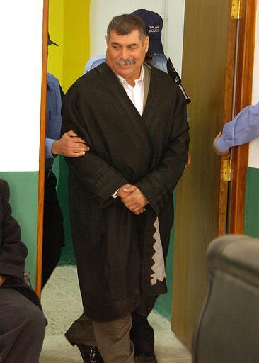 Keywords: Saddam Hussein's former Defense Minister, Sultan Hashim Ahmad, in Baghdad, Iraq.jpg Baghdad Iraq Dec 18 2004 - An investigative hearing is held for Saddam Hussein's former Defense Minister Sultan Hashim Ahmad in Baghdad Iraq The hearing is part of the on going process held by the Iraqi Special Tribunal to bring former regime leadership to justice Presiding over the hearing is Chief Investigative Judge Ra'id Juhi of the Iraqi Special Tribunal U S Air Force photo RELEASED Source http //www news navy mil/view_single asp id 19817 PD-USGov-Military-Navy Sultan Hashim Ahmad al-Tai 2004 in Baghdad |