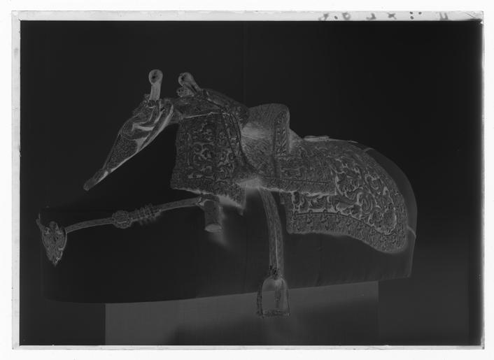 Keywords: Sadel, bomsadel - Le Plaie - Livrustkammaren - 61459-negative.tif Ingående i franska gåvan till Karl XI 1673 Frankrike 1600-talets mitt För hästen nr 2 Le Plaie Bomsadel av blå sammet med rektangulära kappor med reliefbroderi i form av rankor blommor och stiliserade franska liljor Broderi med guld- och silvertråd Utmed kanterna en ca 40 mm bred bård med yttäckande broderi Frambom ca 520 mm bred och 90 mm hög Bakbom med små stödbommar ca 52 mm bred och 90 mm hög Sitsen och bommarnas insidor av blå sammet med rankformiga stickningar av guldtråd Sitsen och bommarnas utsidor kantade med guldtrådsfrans Sadelknapp av förgyllt silver i form av lejonhuvud Framför frambommen 14 + 9 runda blomformiga tännlikor av förgylld mässing Bakom bakbommen 12 + 14 tännlikor av samma material Bom överklädd med tunt läder Bossor av tunt ljusbrunt läder och naturfärgat linne kantning av ljusblått linneband På var sida två stroppar för sadelgjord samt krampa för stigläder Baktill två öglor av vitt läder samt ögla av läder för svansrem Framtill två söljor av stål för förbygel Framför frambommen två krampor av förgylld mässing för pistolhölster original caption Karl XI s myndighetsförklaring 1673 velvet Färg blå S - SADLAR OCH HÄSTUTRUSTNING material sammet - gold thread S - SADLAR OCH HÄSTUTRUSTNING material guldtråd - silver thread S - SADLAR OCH HÄSTUTRUSTNING material silvertråd - silver S - SADLAR OCH HÄSTUTRUSTNING material silver - brass S - SADLAR OCH HÄSTUTRUSTNING material mässing - leather S - SADLAR OCH HÄSTUTRUSTNING material läder - linen S - SADLAR OCH HÄSTUTRUSTNING material linne size mm 570 size mm 290 sits g 7600 LRK Karl XI av Sverige Basutställning Spelet om Skåne 1993 Modelejon 2002 place of origin original filename LN_B12477_015357 54115 inventory number LRK 17520 61459 CC0 Sadel bomsadel - Le Plaie - Livrustkammaren - 61459 tif <gallery caption Different images of same object > File Bomsadel - Livrustkammaren - 59848 tif File Sadel bomsadel - Le Plaie - Livrustkammaren - 78580 tif File Bomsadel - Livrustkammaren - 42727 tif File Sadel bomsadel - Le Plaie - Livrustkammaren - 70021 tif File Sadel bomsadel - Le Plaie - Livrustkammaren - 17842 tif File Sadel bomsadel - Le Plaie - Livrustkammaren - 1535 tif File Sadel bomsadel - Le Plaie - Livrustkammaren - 10095 tif File Sadel bomsadel - Le Plaie - Livrustkammaren - 35784 tif File Sadel bomsadel - Le Plaie - Livrustkammaren - 1537 tif File Sadel bomsadel - Le Plaie - Livrustkammaren - 77765 tif </gallery> |