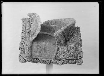 Keywords: Sadel, Frankrike, 1600-talets mitt - Livrustkammaren - 34966.tif Sadel av ursprungligen röd couleur de feu numera blekt sammet med reliefbroderi med guld- och silvertråd i form av rankor och blad Sitsen med tunna rankor med silvertråd samt kantad med frans av silvertråd <br/><br/>Rektangulära kappor fodrade med läder med konturerad kantbård av rankor i reliefbroderi Frambom b 470 mm h 90 mm bakbom b 530 mm h 100 mm med stödbommar Bommarnas insidor med tunna vertikala bladbroderier <br/><br/>Bom överklädd med tunt läder fyra par stroppar av vitt och brunt läder för sadelgjord Dubbla krampor av stål för stigläder <br/><br/>Bossor av naturfärgat linne fodrade med läder <br/><br/>Framför bakbommen 8+11 bakom bakbommen 9+11 gjutna förgyllda mässingstännlikor med dekor i form av en trofégrupp - harnesk framför korslagda fanor <br/><br/>Sadelknapp oval framåt utdragen av förgylld mässing reliefdekor i form av på ovansidan trofégrupp bakom manshuvud samt mansmaskaron på sidorna bladrankor På ovansidan en gjuten oval bygel <br/><br/>Två krampor för fästning av hölster den ena av stål den andra av förgylld gjuten mässing Baktill en läderstropp för svansrem original caption ca 1670 size mm 530 size mm 300 sits LRK Karl XI av Sverige Kung Sol i Sverige 1986 place of origin original filename LN_B04334_007214 45742 inventory number LRK 9146 34966 CC0 Sadel Frankrike 1600-talets mitt - Livrustkammaren - 34966-negative tif Saddles Media contributed by LSH dim-with multiple size templates Horse tack images from Livrustkammaren Media contributed by LSH 2013-10 |